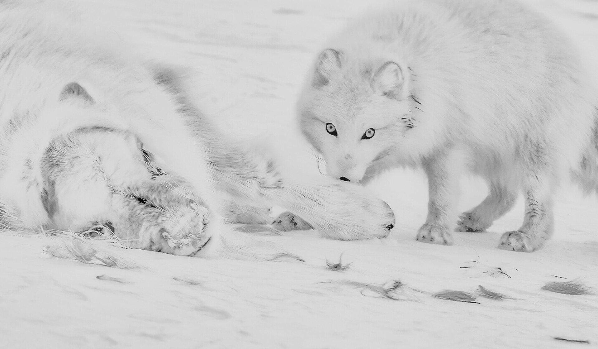 K Flott motiv der blikket til reven er meget godt fanget. Ryggen på reven er litt uheldig kuttet. Liker godt etterbehandlingen som får fram revens blikk og andre detaljer hos dyrene. K Godt svar på oppgaven, flott situasjon med øyekontakt som "bærer" bildet. Snøen er litt for jevnt grå, burde vært justert litt hvitere med bedre kontrast!