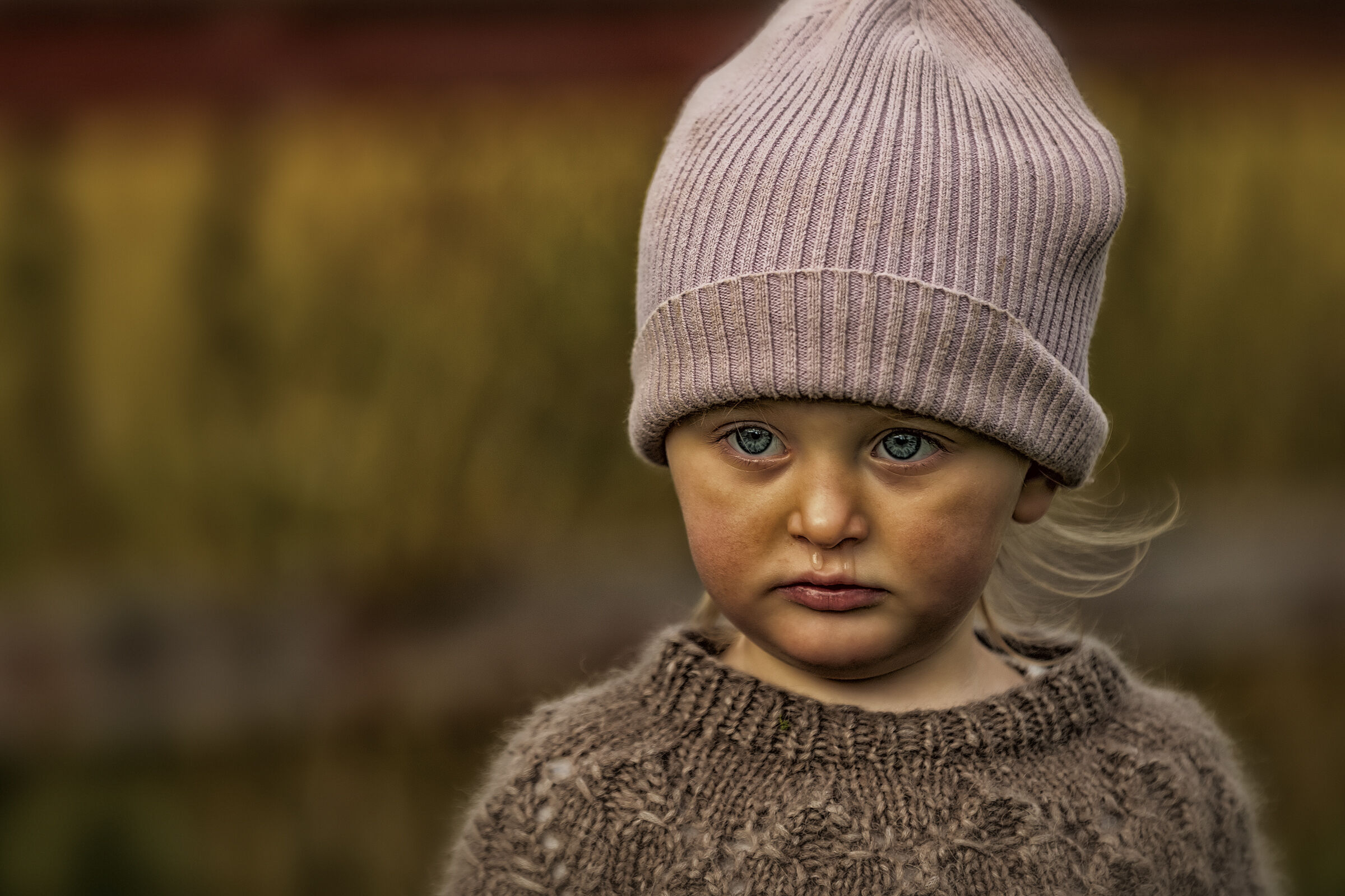 Nydelig jente. Bestemt og intenst blikk og uttrykk. Øynene kommer veldig fint frem hjulpet av lyssettingen men det overeksponerte feltet i håret trekker ned. Behagelige farger.