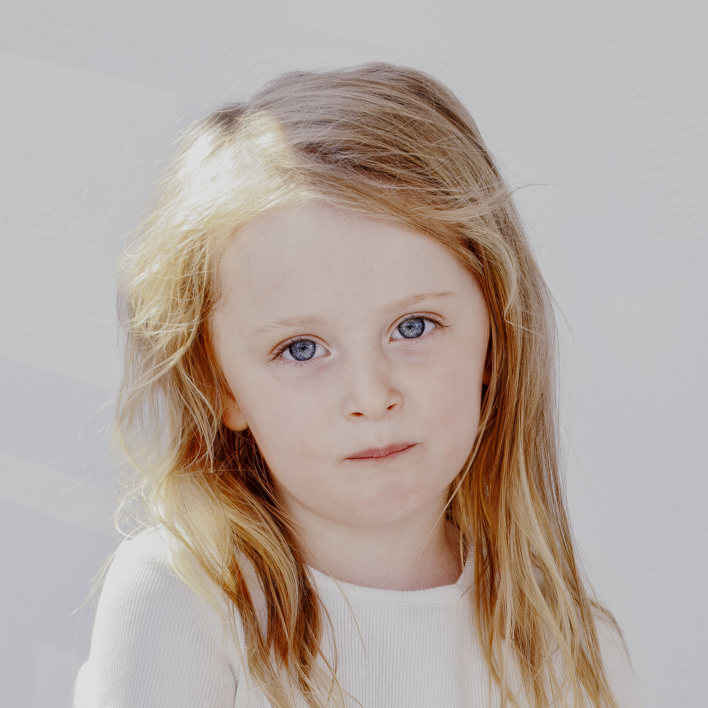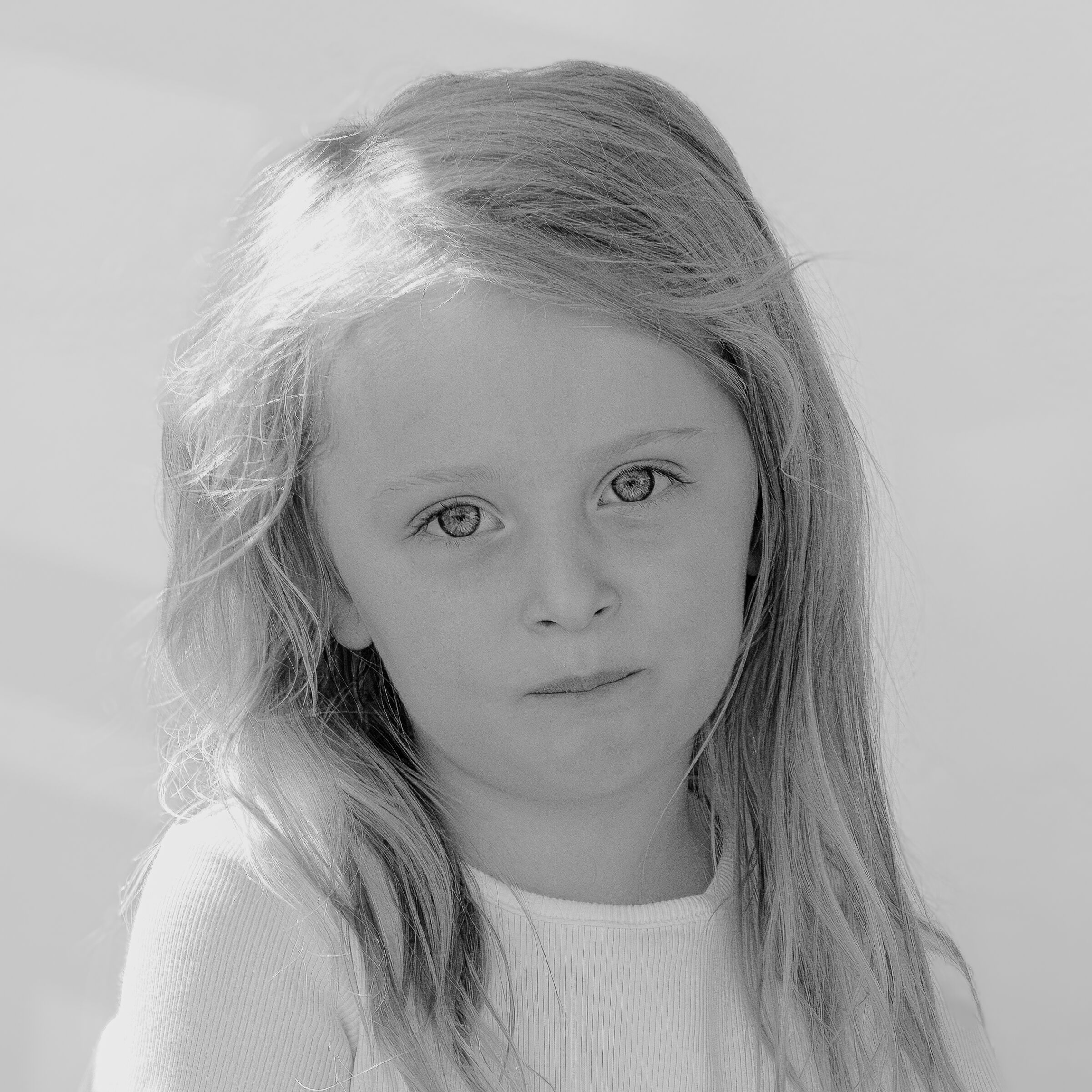 Nydelig jente. Bestemt og intenst blikk og uttrykk. Øynene kommer veldig fint frem hjulpet av lyssettingen men det overeksponerte feltet i håret trekker ned. Behagelige farger.