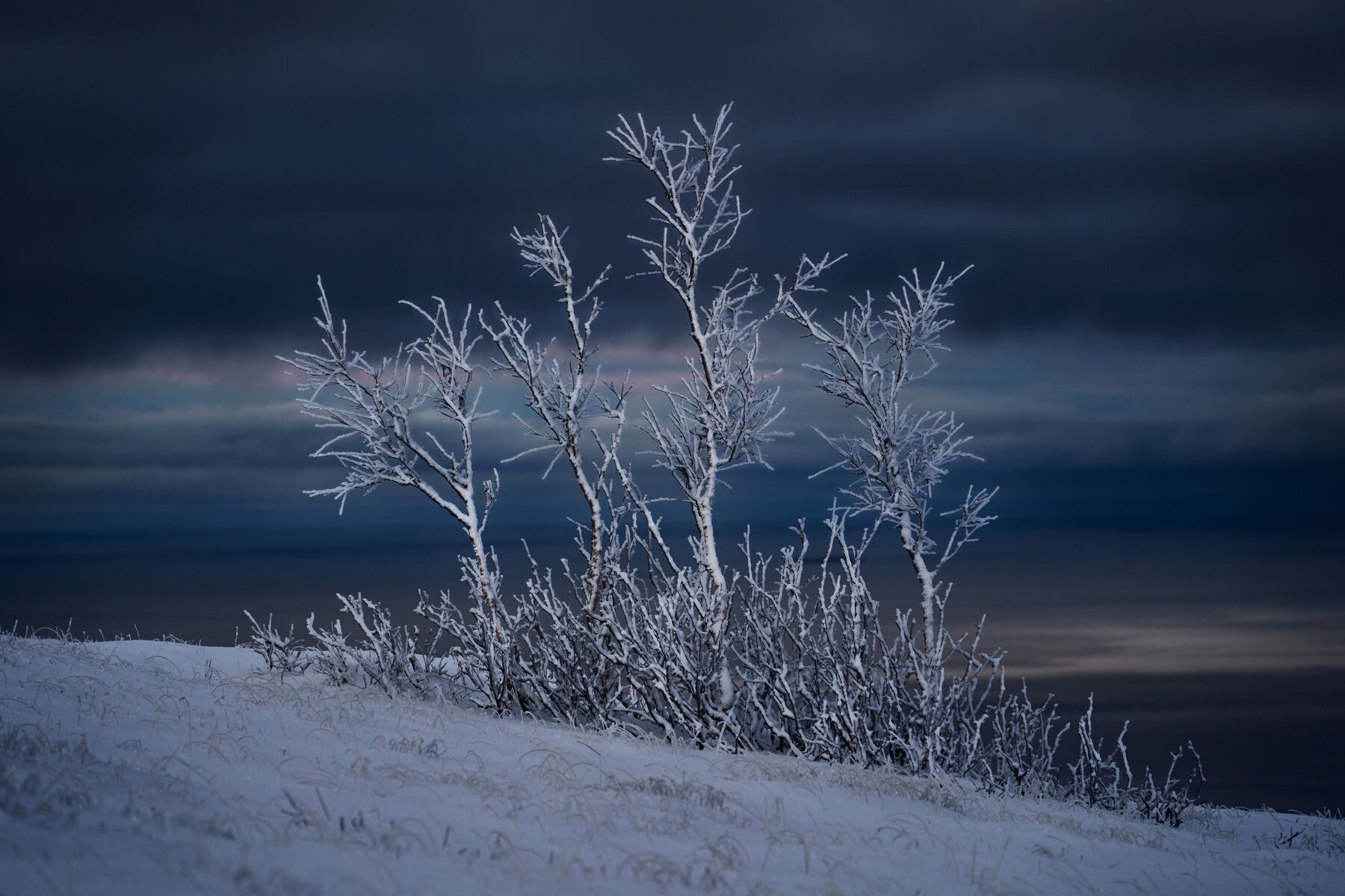 Godt sett, men her må kontrasten økes betraktelig for å fremheve de spinkle, lyse grenene. Kanskje også prøve et kvadratisk utsnitt... Stemningsfult bilde. For midtstilt. Ville prøvd å beskjære noe på venstre side. Fint motiv og komposisjon. Litt mørkt, og fargene i bakgrunnen virker som om de er bearbeidet litt for mye i etterbehandlingen slik at de virker kunstige. Rimen og isen på trærne er flott.