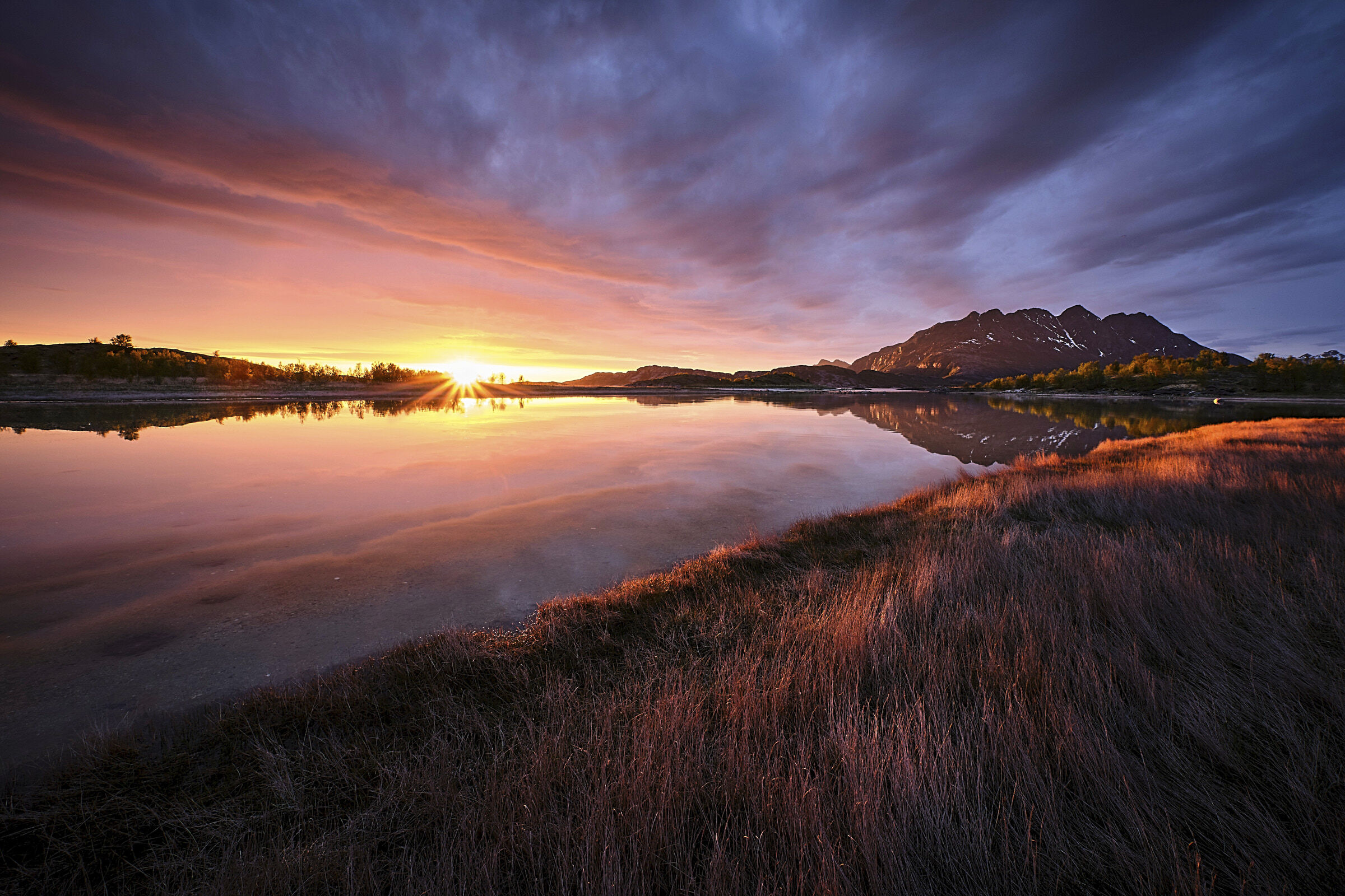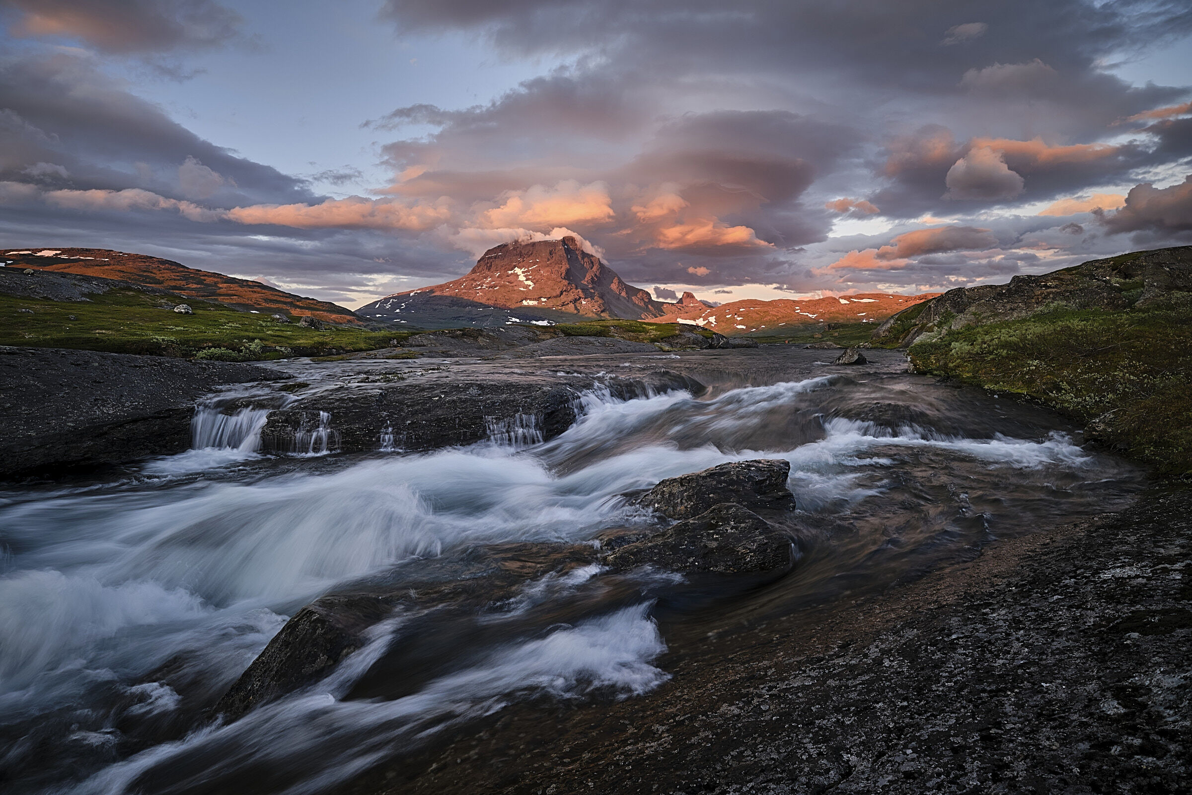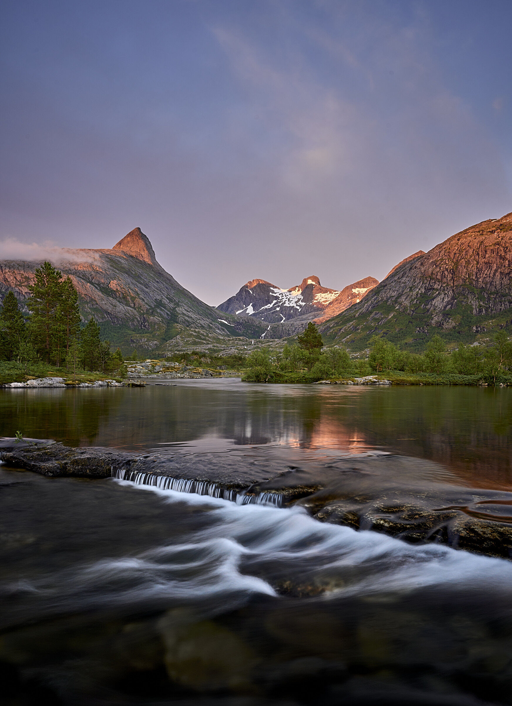 K Flott lys med fint sollys i fjellene. For meg hadde bildet fungert enda bedre med mindre sløring av vannet. K Bildet er i seg selv et flott og godt komponert bilde. Det er litt vanskelig å se av bildet at det er vår eller tidlig sommer. Det litt slørete vannet framhever en rolig stemning