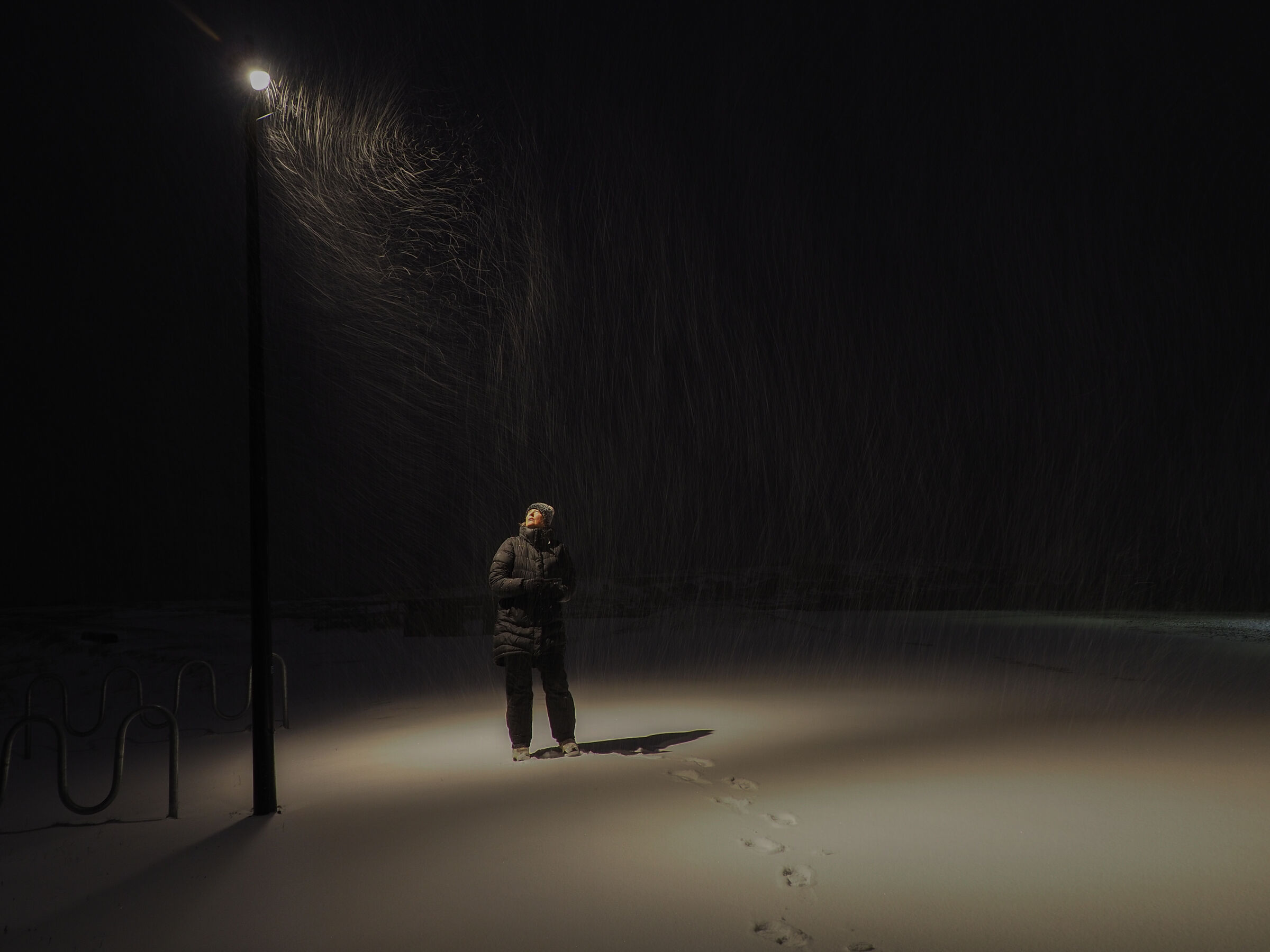 Stemningsfullt bilde.Fint hvordan lyset fra gatelyset treffer personen og lyser opp ansiktet, samtidig som de mørke klærne skaper fin kontrast mot lyset på snøen. Snø-drivet som vises i lyset er med å løfte bildet.