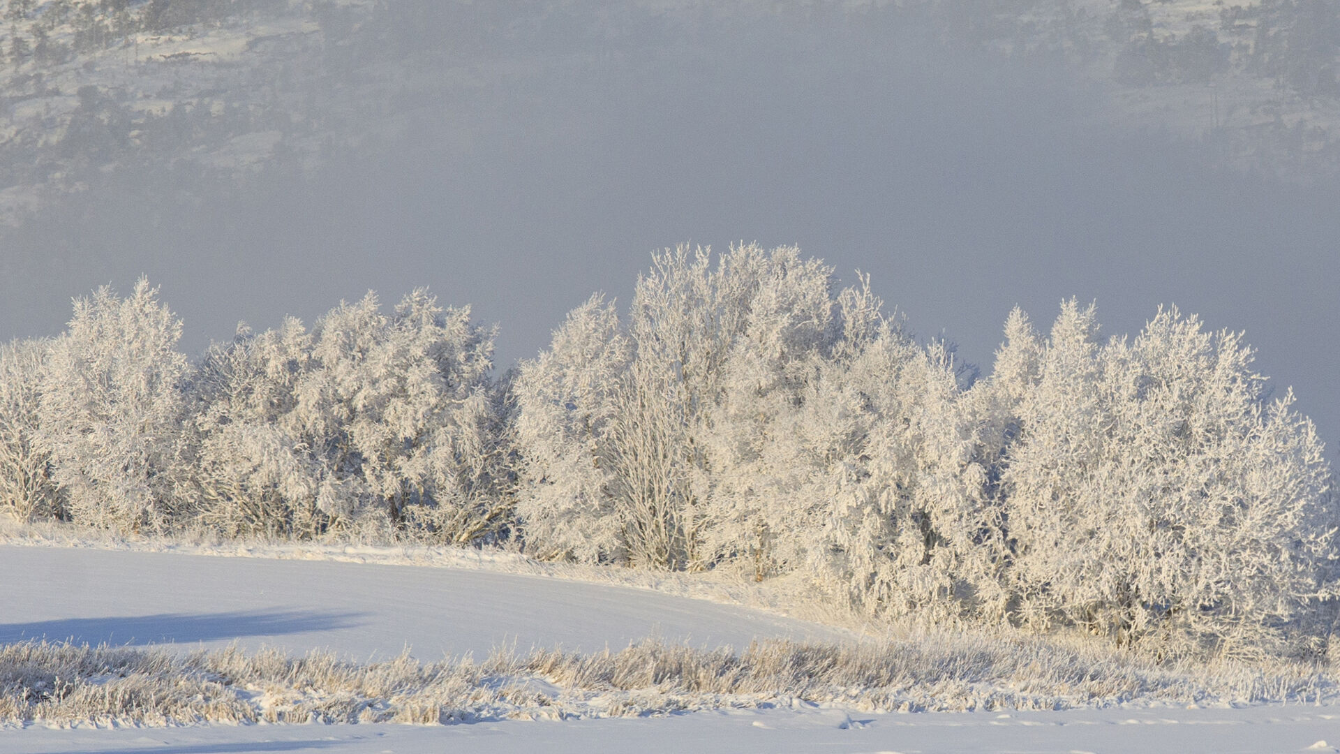 Godt sett, men her må kontrasten økes betraktelig for å fremheve de spinkle, lyse grenene. Kanskje også prøve et kvadratisk utsnitt... Stemningsfult bilde. For midtstilt. Ville prøvd å beskjære noe på venstre side. Fint motiv og komposisjon. Litt mørkt, og fargene i bakgrunnen virker som om de er bearbeidet litt for mye i etterbehandlingen slik at de virker kunstige. Rimen og isen på trærne er flott.