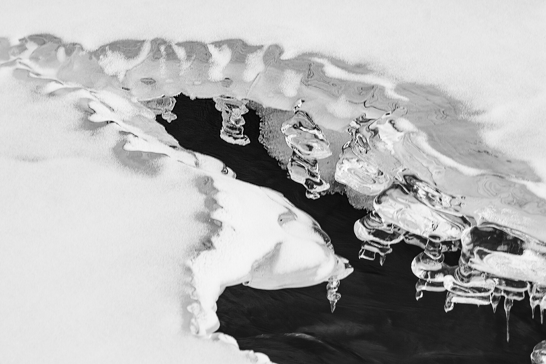 K Is- og snødetaljer tett på er alltid spennende... men dette ble litt "løst i fisken" komposisjonsmessig. K De klare isklumpene er fine, og det svarte vannet gir en fin linje inn i bildet. Snøen rundt som bare virker skitten, trekker ned.