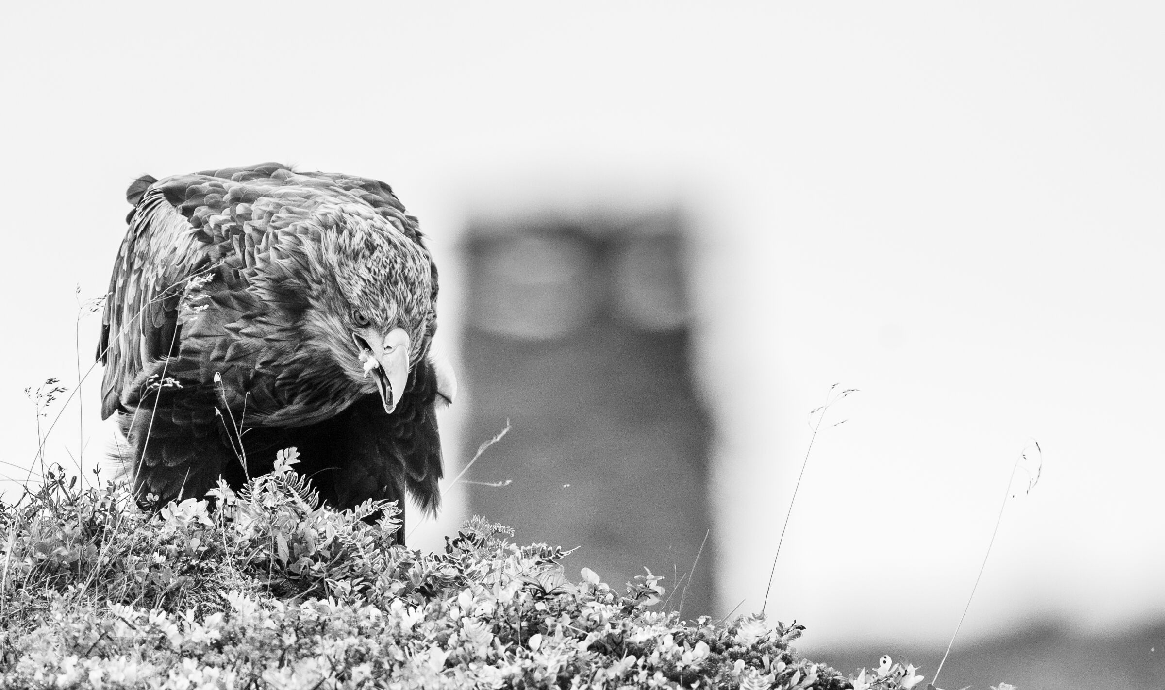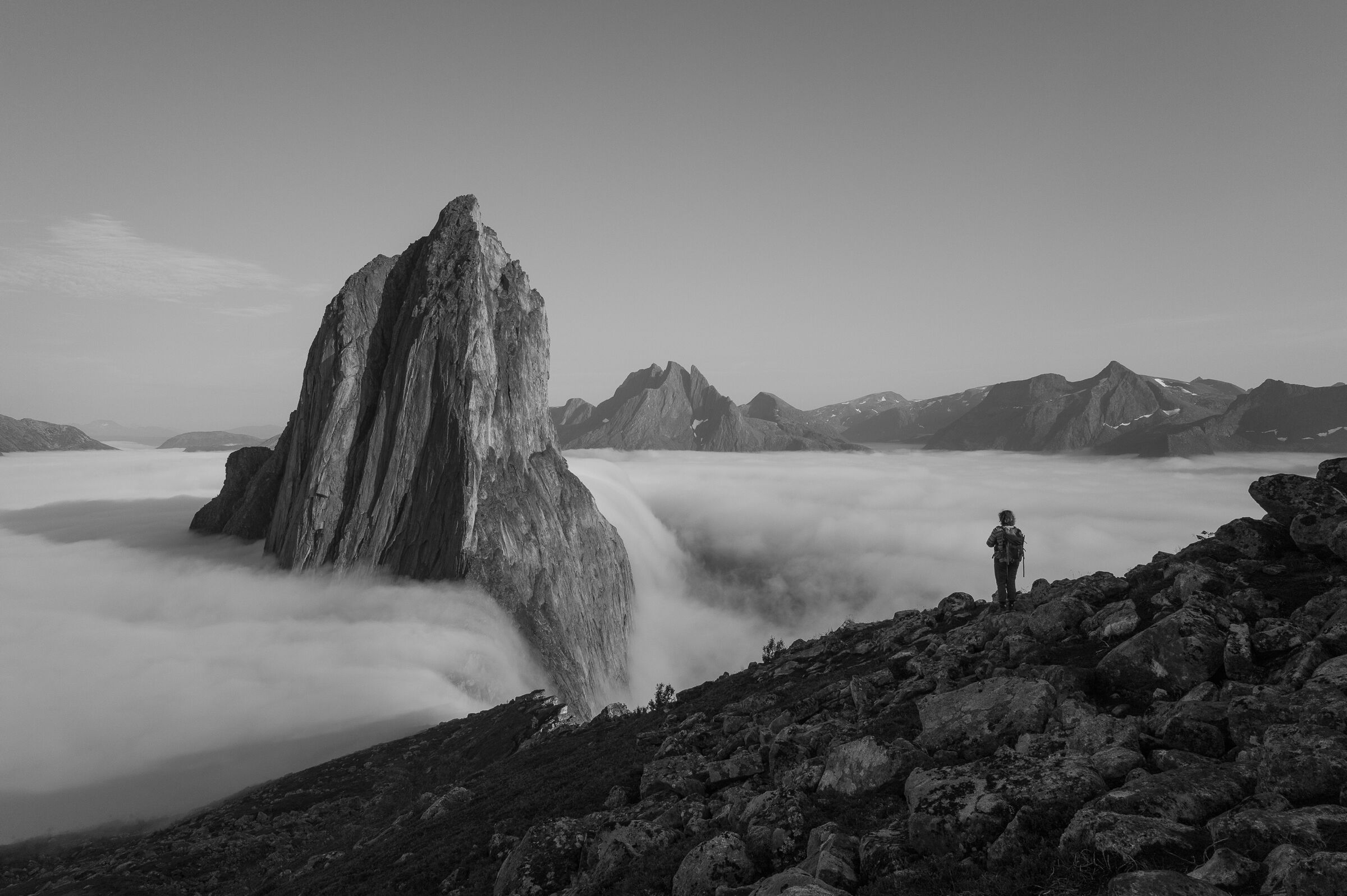 Spennende bilde. Skyene/tåken som siger ned fra fjellet er med på å skape dybde i bildet. Nesten som man får lyst til å dukke ned for å se hva som befinner seg der nede. God bredde i gråtonene.