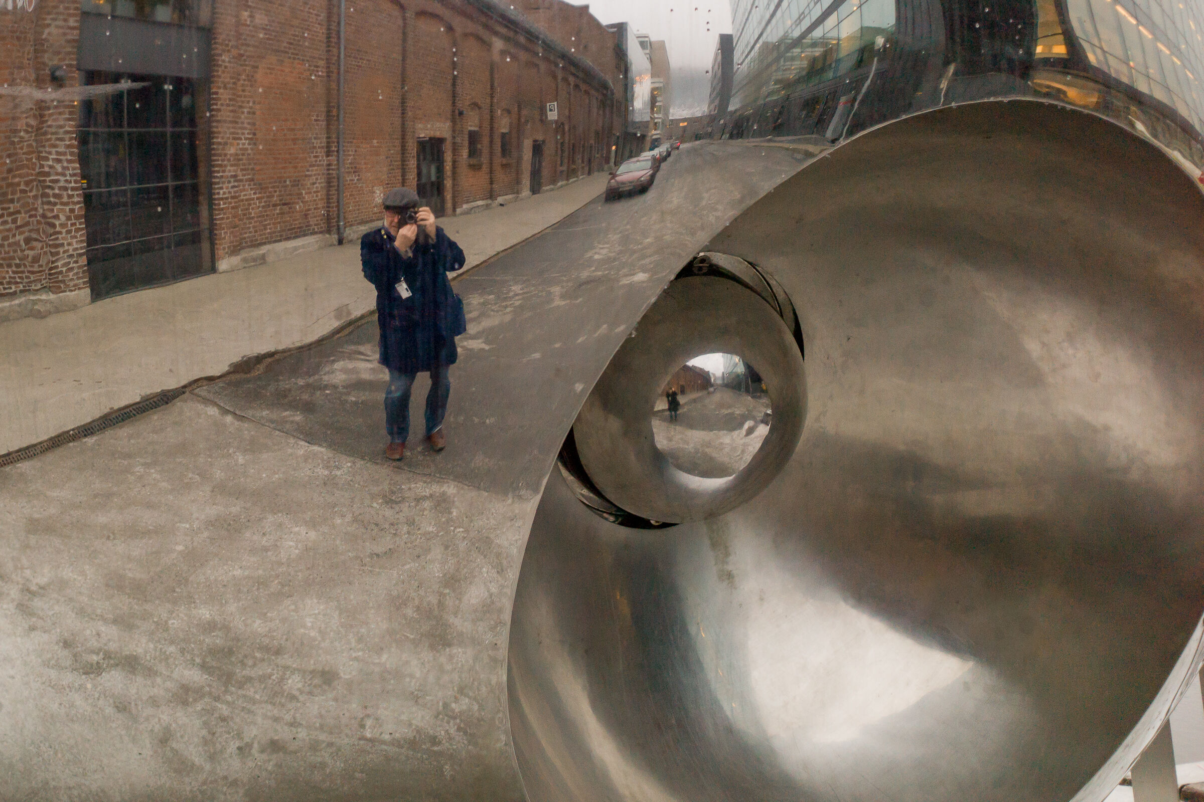 Stemningsfullt bilde.Fint hvordan lyset fra gatelyset treffer personen og lyser opp ansiktet, samtidig som de mørke klærne skaper fin kontrast mot lyset på snøen. Snø-drivet som vises i lyset er med å løfte bildet.